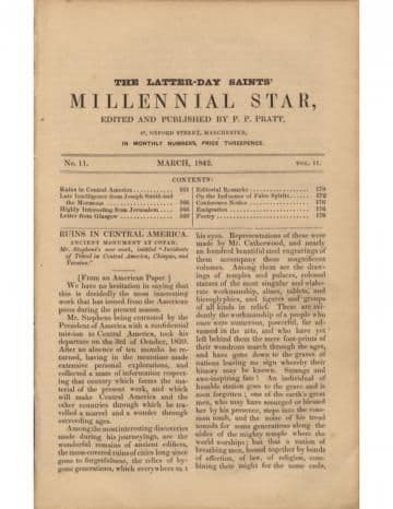 The “mystery” which Mr. Stephens and the wise men of Babylon acknowledge themselves entirely unable to fathom, has, by a God in heaven that revealeth secrets, been opened, brought forth from amid the mouldering archives and sepulchral ruins of a nation and a country before unknown to the other parts of the world. It is a striking and extraordinary coincidence, that, in the Book of Mormon, commencing page 563, there is an account of many cities as existing among the Nephites on the “narrow neck of land which connected the north country with the south country;” and Mormon names a number of them, which were strongly fortified, and were the theatres of tremendous battles, and that finally the Nephites were destroyed or driven to the northward, from year to year, and their towns and country made most desolate, until the remnant became extinct on the memorable heights of Cumorah (now western New York),—I say it is remarkable that Mr. Smith, in translating the Book of Mormon from 1827 to 1830, should mention the names and circumstances of those towns and fortifications in this very section of country, where a Mr. Stephens, ten years afterwards, penetrated a dense forest, till then unexplored by modern travellers, and actually fines the ruins of those very cities mentioned by Mormon.