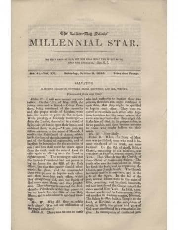 Elder B. when the Book of Mormon was published, some who read it be-came convinced of its truth, and were baptized. On the 6th of April, 1830, a Church, consisting of six members, was organized at Fayette, Seneca county, New York. That Church was the Church of Jesus Christ of Latter-day Saints. The youth who was the instrument in bringing forth the book, and in organizing the Church, was Joseph Smith. The Church increased rapidly in numbers, and in the gifts of the Spirit. In the fall of the year, several Elders went to the state of Ohio, preaching, and baptized hundreds, and also introduced the Gospel into all the states west of New York. In 1831, a settlement was formed in Lake county, Ohio, and another in Jackson county, Missouri. The Saints in Ohio built a Temple to the Lord, at Kirtland, at the completion of which, in 1836, the power and glory of God were manifested in a remarkable degree. In consequence of continued persecution the Ohio settlement was abandoned in the year 1838. The Saints in Missouri laid the foundation stone for a Temple, at Independence, Jackson county, on the 3rd of August, 1831. This Temple is not yet built. The Saints were driven by mob violence from Jackson county to Clay county, in 1833. Soon after, they were driven from Clay county to Caldwell and other counties. In the winter of 1838-9, the Saints were expelled, at the bayonet’s point, from the state of Missouri. In these awful persecutions and drivings, neither age, sex, nor condition was spared from the most revolting brutality, such was the relentless cruelty of the enemies of the Saints. In 1839, they began to gather on the east bank of the Mississippi, in the state of Illinois, and commenced to build up the city of Nauvoo, and soon afterwards a noble Temple. The Temple was finished and dedicated in 1846. In 1837, Elders were sent on a mission to Britain, where they succeeded in baptizing multitudes. In 1843, Elders were sent to the Society Isles, where numerous converts were made. On the 27th of June, the same year, the Prophet Joseph Smith, and his brother Hyrum, the Patriarch, were cruelly murdered by a mob, armed and disguised, in Carthage jail, twelve miles from Nauvoo, where these two men of God were thrown, for pretended crimes, and held for trial under the government pledge of personal safety. During his lifetime, Joseph Smith was embroiled in nearly fifty law-suits, yet was never legally convicted of any offence to the law of the land. In 1846, the Saints, again assailed by persecution, were compelled to quit Nauvoo. Fifteen thousand to twenty thousand people were obliged to vacate their dearly bought homes, travel across the vast prairies, and seek a home among the wild fastnesses of the Rocky Mountains. While in this condition, the government of the United States required the Saints to furnish a battalion of able-bodied men to aid in the Mexican war. This unjust requisition was complied with, and five hundred men were immediately enrolled, and sent to California, leaving their wives and families destitute in an Indian country. In July, 1847, a pioneer company of the Saints entered the Valley of the Great Salt Lake. Setting aside the incidental privations of a new settlement, especially under these circumstances, that and the surrounding vallies have ever since been the peaceable and prosperous home of the Saints. They are now organized as a territory of the United States. Cities have been built, lands improved, and a Temple two hundred feet long is in progress. During the last four years, flourishing missions have been established in France, Germany, Denmark, Sweden, Norway, Iceland, Italy, Switzerland, Malta, Gibraltar, Hindostan, Australia, and the Sandwich Isles; and Elders have recently been sent to Siam, Ceylon, China, the West Indies, British Guiana, and Chili. The Latter-day Saints in Britain now number about thirty thousand. About twenty thousand have left these shores to go to the head quarters of the Church. Between two thousand and three thousand leave Britain annually, for the same destination. The Book of Mormon is published in English, Welsh, French, German, Italian, Danish, and Polynesian. The Doctrine and Covenants of the Church is published in English, Welsh, and Danish. The following papers and periodicals are now in circulation—The “Deseret News,” published semi-monthly, at Great Salt Lake City; the “Seer,” monthly, at Washington, United States; the “Millennial Star,” weekly, at Liverpool; the “Udgorn Seion,” in Welsh, weekly, at Merthyr Tydfil; the “Skandinaviens Stierne,” in Danish, semi-monthly, at Copenhagen; and “ Le Réflecteur,” in French, monthly, at Lausanne.