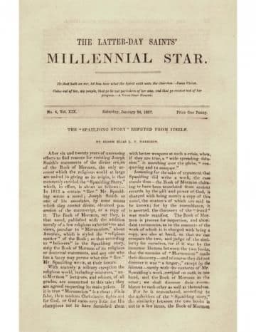 After six and twenty years of unceasing efforts to find reasons for resisting Joseph Smith's statements of the divine origin of the Book of Mormon, the only account which the religious world at large are united in giving as its origin, is that commonly entitled the “Spaulding Story,” which, in effect, is about as follows:— In 1812 a certain “Rev.” Mr. Spaulding wrote a novel; Joseph Smith or one of his associates, by some means which they cannot divine, obtained possession of the manuscript, or a copy of it. The Book of Mormon, say they, is that novel, published with the addition merely of a few religious exhortations and views, peculiar to “Mormonism," about America, which is styled the “religious matter’’ of the Book; so that according to “believers" in the Spaulding story, strip the Book of Mormon of its religious or doctrinal statements, and any one who has a fancy may peruse what this “Rev." Mr. Spaulding wrote, at their leisure.