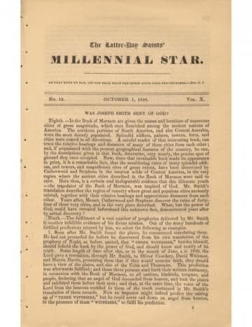 2. Before the “Church of Jesus Christ of Latter-day Saints” had any existence upon the earth, the prophecy of Moroni was translated and printed in the Book of Mormon, It is expressly predicted in this prophecy, that in the day that that book should be revealed, “the blood of the Saints should cry unto the Lord from the ground" because of the wickedness of the people, and that the “time should soon come when,” because of the cries and mourning of “widows and orphans," whose husbands and fathers should be slain by wicked hands, “the Lord should avenge the blood of his Saints." And again, in August, 1831, the word of the Lord came to Mr. Smith, saying that “the Saints should be scourged from city to city, and from synagogue to synagogue," and that but “few” of those then in the church should “stand to receive an inheritance.”—(See Book of Doctrine and Covenants, page 151.) The blood of many hundreds of Saints who have been slain and martyred in this church, is an incontrovertible evidence of the truth of the prediction. Surely Mr. Smith must have been a prophet of God to have foreseen not only the rise of the church of the Saints, but that their blood should cry aloud from the ground for vengeance upon the nation who should perpetrate these bloody deeds. No human foresight could have seen the bloody sceneries that were to take place after the rise of the church. All natural appearances in the United States were against the fulfilment of this dreadful prediction. Every religious society throughout the whole country was strongly guarded against persecution and religious intolerance by the strong arm of the civil law. The glorious constitution of that great and free people proclaimed religious freedom to every son and daughter of Columbia’s soil: yet, in the midst of that boasted land of freedom and religious rights, where universal peace seemed to have selected her quiet dwelling place, the voice of a great prophet is heard predicting the rise of the Latter-day Church, and the bloody persecutions that should follow her “from city to city, and from synagogue to synagogue.” Never were there any prophecies more literally and palpably fulfilled since the creation of the earth. If the foretelling of future events that could not possibly have been foreseen by human wisdom—events, too, that to all outward appearances were very unlikely to come to pass: if the predicting of such events and their subsequent fulfilment constitutes a true prophet, then Joseph Smith must have been a true prophet, and, if a true prophet, he must have been sent of God.