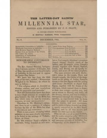 A few weeks since we attended a discussion in the Carpenter’s Hall, Manchester, held between a man calling himself the Rev. Mr. Sleep, professing to be of the Methodist Episcopal Church, in Rhode Island, America, and Elder Wm. Hardman, of this town. Subject, The Book of Mormon.