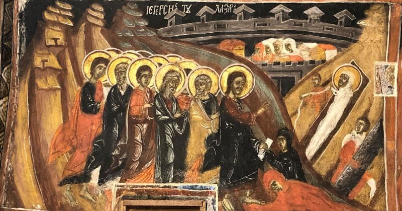 *Note on Header Image: This is one of many scenes that are painted onto the walls and ceilings of a seventeenth-century church in Arbanassi, Bulgaria. Here, viewers see Jesus in the center raising his right hand in blessing, as Lazarus will come forth from the stone-tomb, his burial shroud beginning to unwind. Lazarus has a gold halo, indicating his holy discipleship. He will become known as St. Lazarus. Jesus’s left hand appears to be receiving the message that Lazarus had died. The women in black and red are likely Martha and Mary. Behind Jesus are eleven disciples. Presumably Judas is the one not shown. In the lower right, a servant moves away the stone that had covered the entrance to the tomb. In the top-center, the walls around Jerusalem enclose the Temple, with the flaming altar of sacrifice on the left. Caiaphas and three other chief priests or Pharisees are in the middle, with two structures on the right. Being told by eyewitnesses about Jesus’s raising of Lazarus in Bethany, Caiaphas will convene the Sanhedrin. They will debate what to do in the face of this miraculous sign that threatens to lead everyone in Jerusalem to follow Jesus. Even miracle workers can be convicted of leading people into apostasy under Deuteronomy 13. And Caiaphas will rule that it is better for Jesus to be executed than for a riot to break out, for the holy city and temple to be taken away by the Romans, and all the people to be destroyed. An order for the capture of Jesus was sent out. Not finding Him, the Sanhedrin will further rule that Lazarus also was worthy of death, apparently on the allegation of complicity with Jesus in working to deceive the people.
