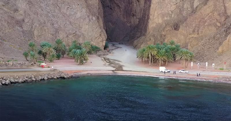 Now another video has been uploaded on the internet showing the same location, but from an aerial perspective. It also shows the river, but unlike the previous video it does not show a raging torrent, nor does it show the stream almost reaching the shoreline above ground as appears in previous images available. Instead, the new video—believed to have been filmed in recent months—shows the stream flowing completely across the broad delta of the wadi mouth, then crossing the sealed road to reach the Red Sea shoreline. This has now actually become the best image we have illustrating Nephi’s record: