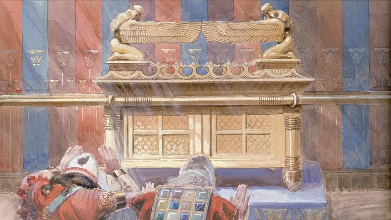The Ark itself was a box made from acacia wood, which came from an extremely durable type of tree: Acacia trees were some of the only trees that grew in the harsh desert where the children of Israel wandered for 40 years. This box was then overlaid with gold. Atop the Ark sat the mercy seat: a solid gold lid with two gold cherubim on top. On the Day of Atonement, priests would perform a ritual sacrifice for all of Israel, and, using the blood from that sacrifice, the high priest would then enter the Holy of Holies to sprinkle or “cover” the mercy seat. Importantly, the original word for “atonement” comes from the Hebrew word “kaphar,” which means, “to cover.” Thus, in performing this ritual, the high priest symbolized that it was only through the shedding of sacrificial blood that one could find mercy and enter the presence of God.
