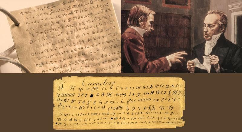 Replica of the gold plates with reformed Egyptian characters via Church News