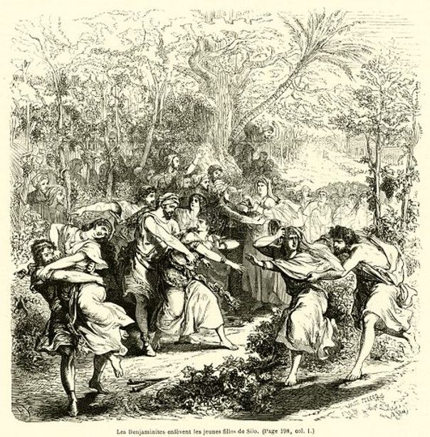 Men Capture Maidens | “then come ye out of the vineyards, and catch you every man his wife of the daughters of Shiloh” (21:21) | “they came forth out of their secret places and took them and carried them into the wilderness” (20:5) |