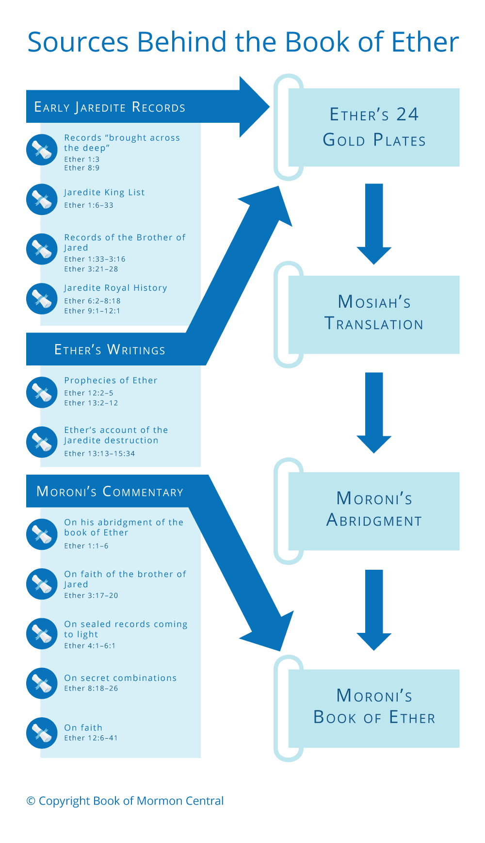 The book of Ether has a complex production history with layers of source documents that have been distinctively edited into a coherent abridgment.The book of Ether contains the origin story and political history of the Jaredite civilization, as summarized and abridged by the prophet Ether. That history, written on 24 gold plates, was discovered by the people of Limhi (Mosiah 8:7–9). Limhi’s people then transferred the record to King Mosiah, who translated it by the gift and power of God (Mosiah 28:11–19). The record was then kept by the Nephite prophets until it fell into the hands of Moroni, who further summarized its contents and added his own extensive commentary (Ether 1:2).1 The following chart can help readers keep track of the book of Ether’s primary sources and complex production history: