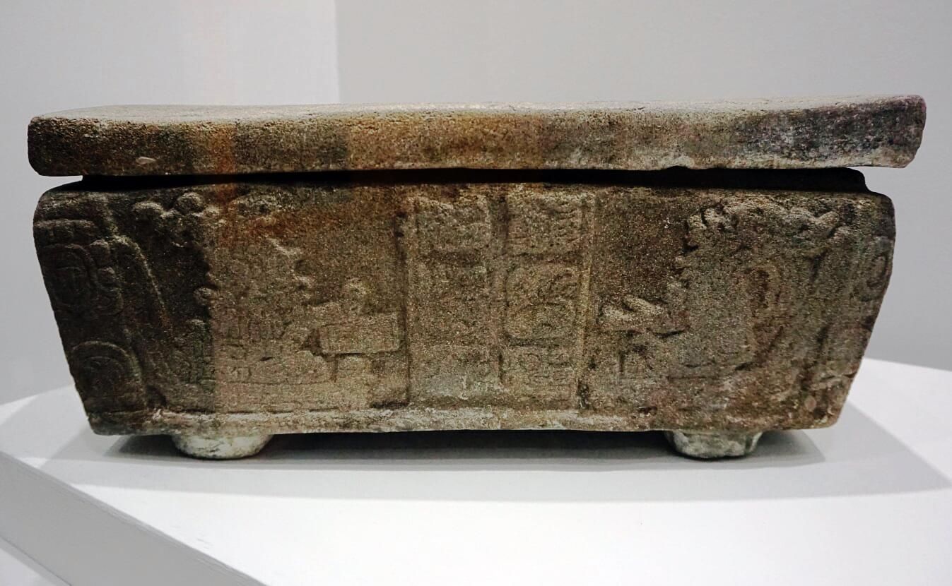 Moving to the New World, there is some evidence that the ancient Maya may have stored documents in various types of boxes.4 The dimensions of a stone box discovered in a Guatemalan cave, for example, seem appropriate for the storage of Maya books known as codices.5 The sides of the box depict deities interacting in various ways with codices, leading researcher to suspect that the stone container “may well have once held a codex.”6 Other discoveries of box-like receptacles, or iconographic depictions of them, suggest that some ancient Maya books were indeed “kept in ‘bespoke’ boxes … as objects of sacred meaning, to be set apart, kept apart, ritually activated, perhaps even sprinkled with incense and other offerings.”7
