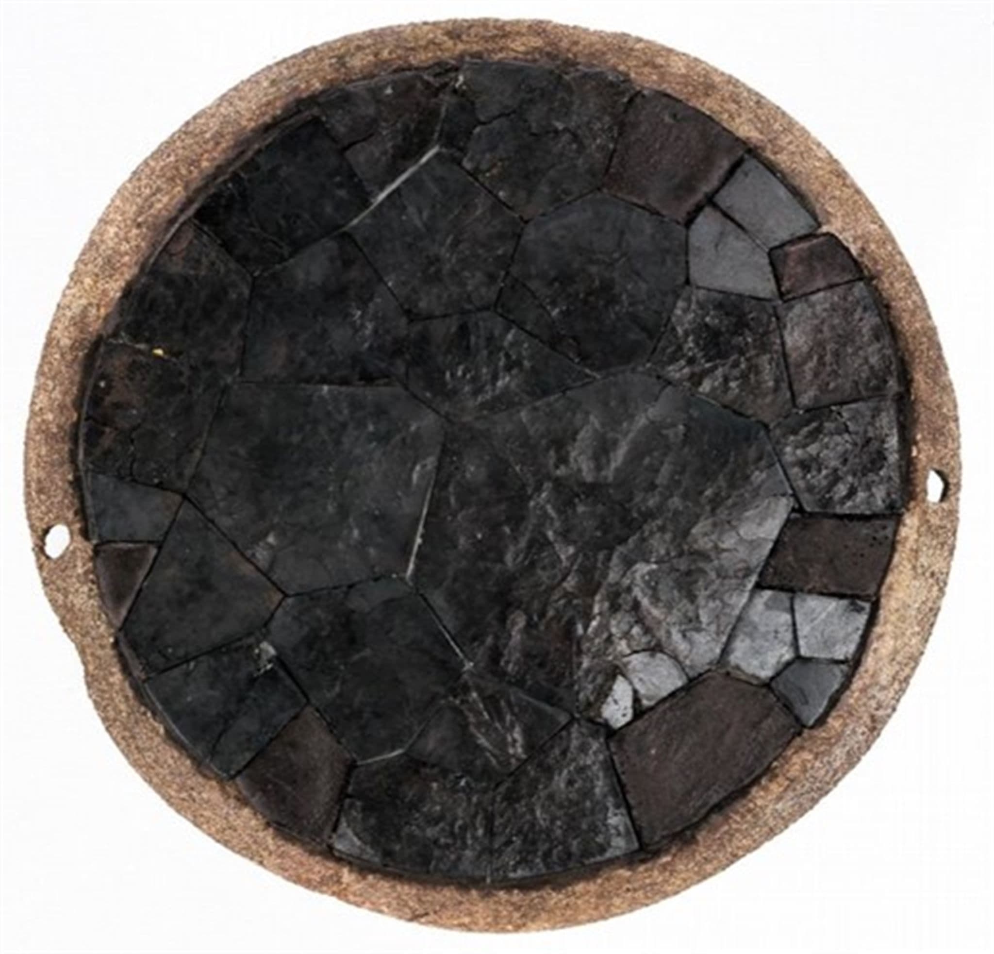 - 6. See Julie Gazzola, Sergio Gómez Cháves, and Thomas Calliaro, “Identification and Use of Pyrite and Hematite at Teotihuacan” in Manufactured Light, 107–124. See, for example, the comments on p. 108: “Pyrite and hematite were also important in the decoration of sculptures and masks, used primarily as incrustations in the eyes. Its use has been inferred in the manufacture of mirrors formed by tesserae in sheets adhering to slate supports. Pyrite was used in these distinctive ornaments, in the form of disks (identified as tezcacuitlapillis) carried on the lower back by the upper classes (possibly military and priests), as a kind of brooch or mirror and/or as a status distinction.” Concerning the discovery of more than 200 discs of various sizes and degrees of preservation, the authors write on p. 115: “Most of the disks had several holes that were most likely used to tether the object with a cord, as a pendant. Some disks, identified by their dimensions as tezcacuitlapillis, present incised motifs and cinnabar, while another example is completely impregnated with red ocher on one side and probably pyrite on the other. Other slate disks are smaller and unperforated. They could have been used as decorations or as pendants, rather than as tezcacuitlapillis, with pyrite or hematite attached to one side.” The authors further state on p. 115 that it “is likely that the plates formed part of necklaces, breastplates, or armor used by personages with a high social status.” Pyrite and hematite were also used in dental inlays. See Andrea Sandoval Molina, Yoshiyuki Iizuka, and Shintaro Suzuki, “Preclassic Mesoamerican Dental Inlays: Study of the Raw Material by SEM–EDS,” STAR 5, no 2 (2019): 157–163. For further examples of the use of iron ores in clothing, see Tomás Barrientos Quezada, “Reflecting on Reflections.”