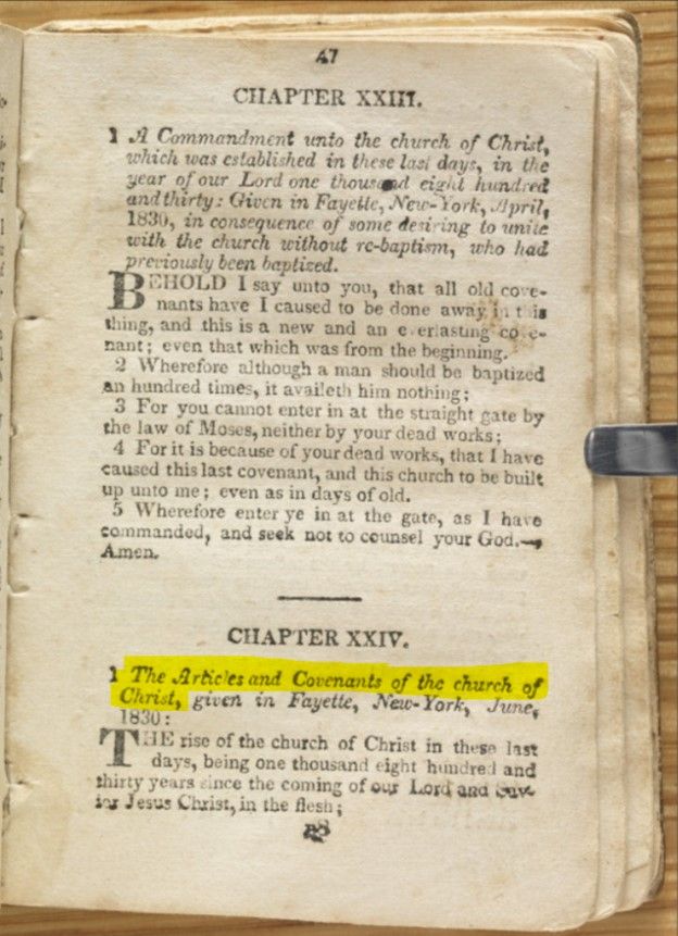 Another clear example of dependence on the Nephite record can be seen in an early Church document titled “Articles of the Church of Christ” (which is briefly mentioned in the chart above). It was created in 1829 by Oliver Cowdery, based on a revelation commanding Oliver to “rely upon the things which are written; For in them are all things written concerning the foundation of my church” (D&C 18:3–4). As explained by F. Scott Faulring,