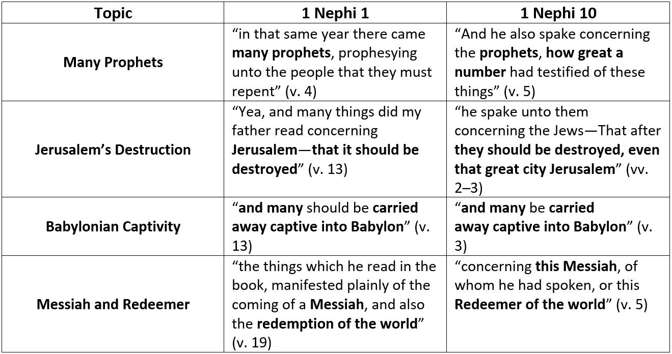 Nephi’s third and final use of “mysteries” occurs eight chapters later in 1 Nephi 10:19: “he that diligently seeketh shall find; and the mysteries of God shall be unfolded unto them.” Prior to making this statement, Nephi again recounted prophecies from his father, which are related to and expand upon Lehi’s initial visionary experience (as seen in the following chart).