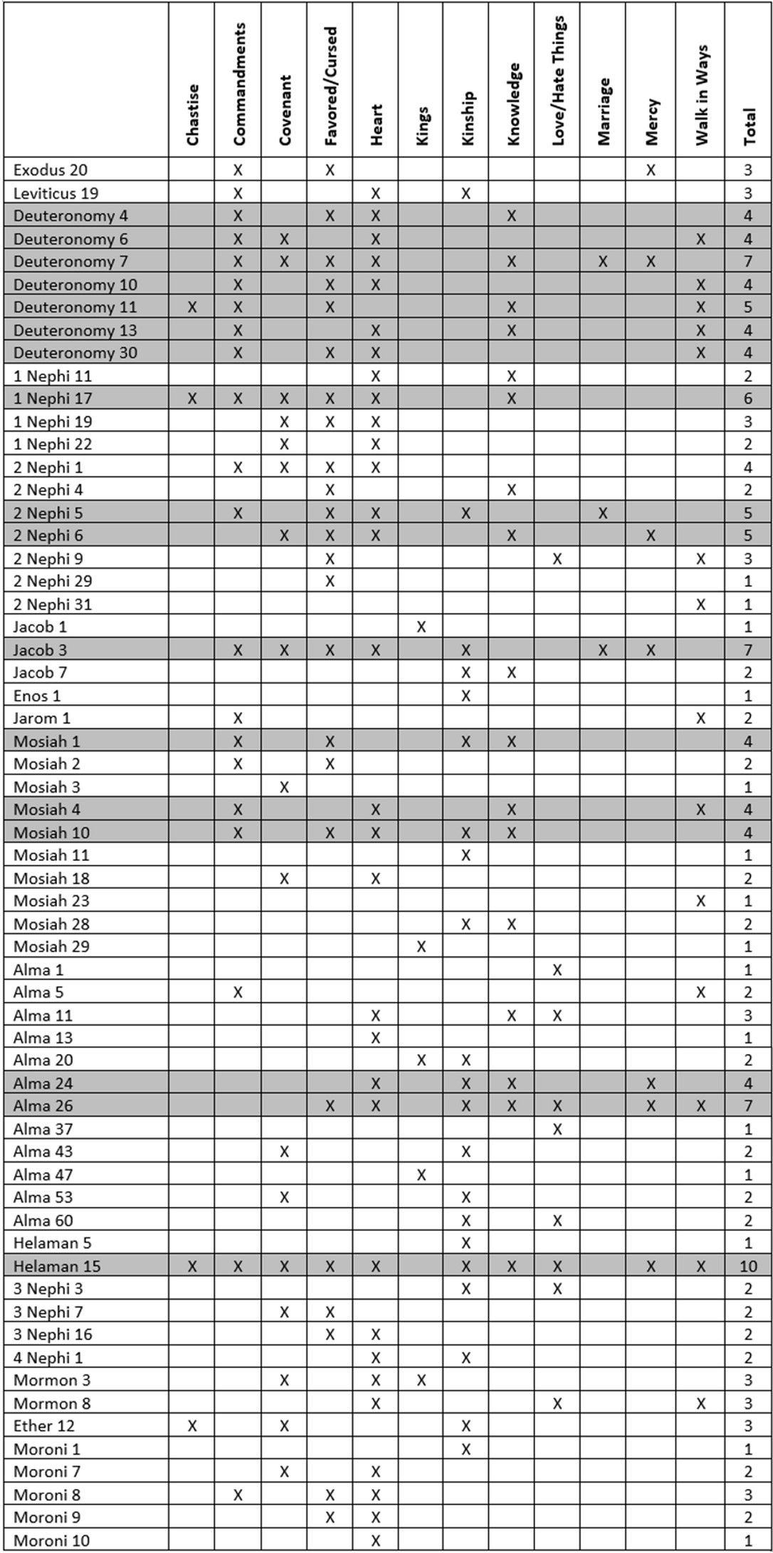 After presenting several biblical texts which contain concentrations of these elements, their presence is tracked in numerous Nephite texts. Chapters with four or more elements have been highlighted in gray for easier identification. For a more detailed presentation of these noteworthy textual units, showing specifically where and how frequently these elements cluster together in these chapters, see Appendix 2.