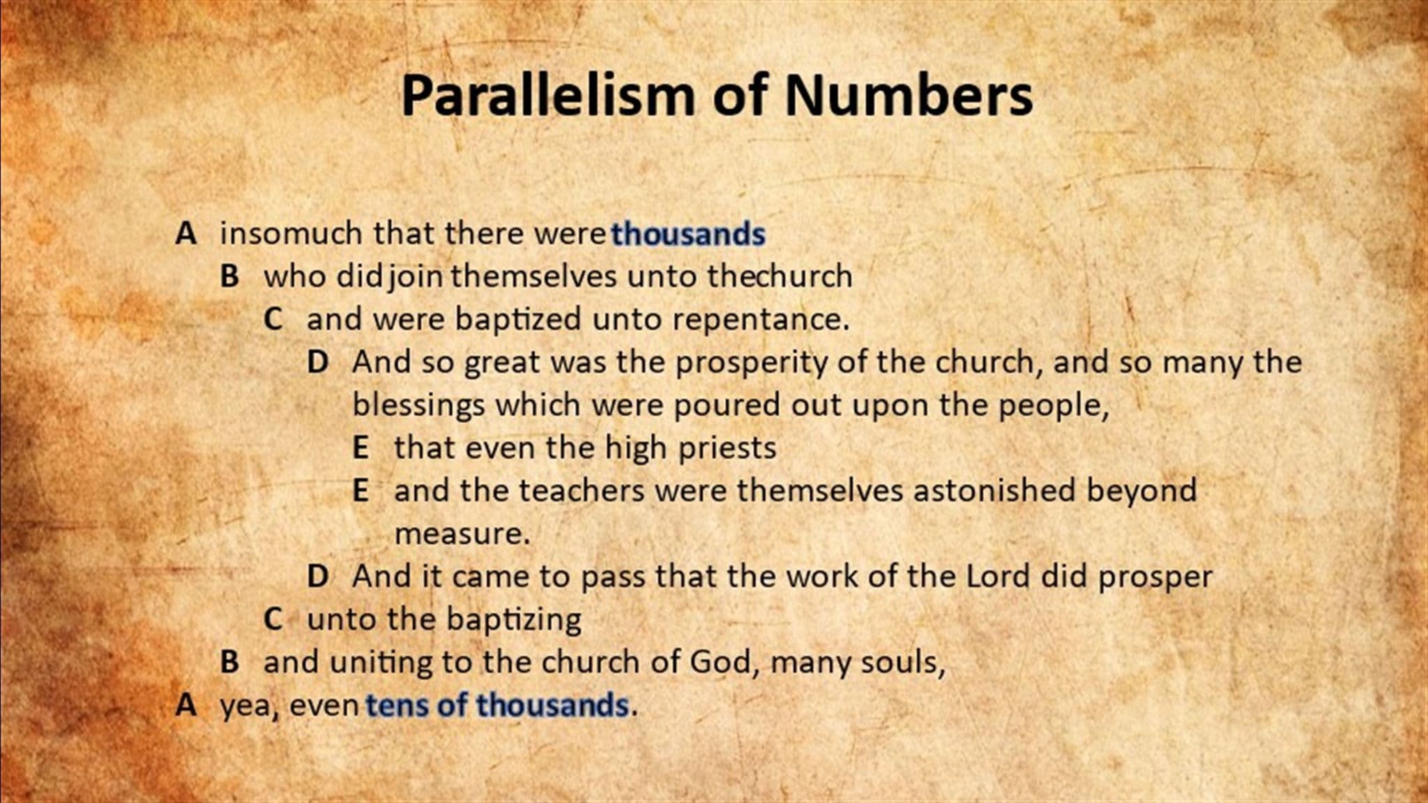 The Book of Mormon features far fewer examples of parallel numbers than are found in the Bible. Nevertheless, those that can be identified possess similar features, including the principle of amplification. Parallelism of numbers thus provides another evidence of the Book of Mormon’s Hebrew literary origins.