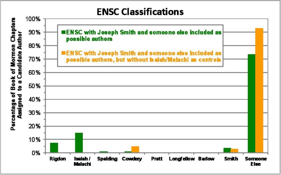 In 2011, Paul Fields, Bruce Schaalje, and Matthew Roper reviewed the Jockers et al. study and introduced an improvement upon the NSC method, which they termed extended nearest shrunken centroid classification (ENSC).33 This allowed for the possibility that an unknown author (or authors) not included in the set of potential candidates could have written the text. The Fields et al. study also included Joseph Smith as a candidate author.