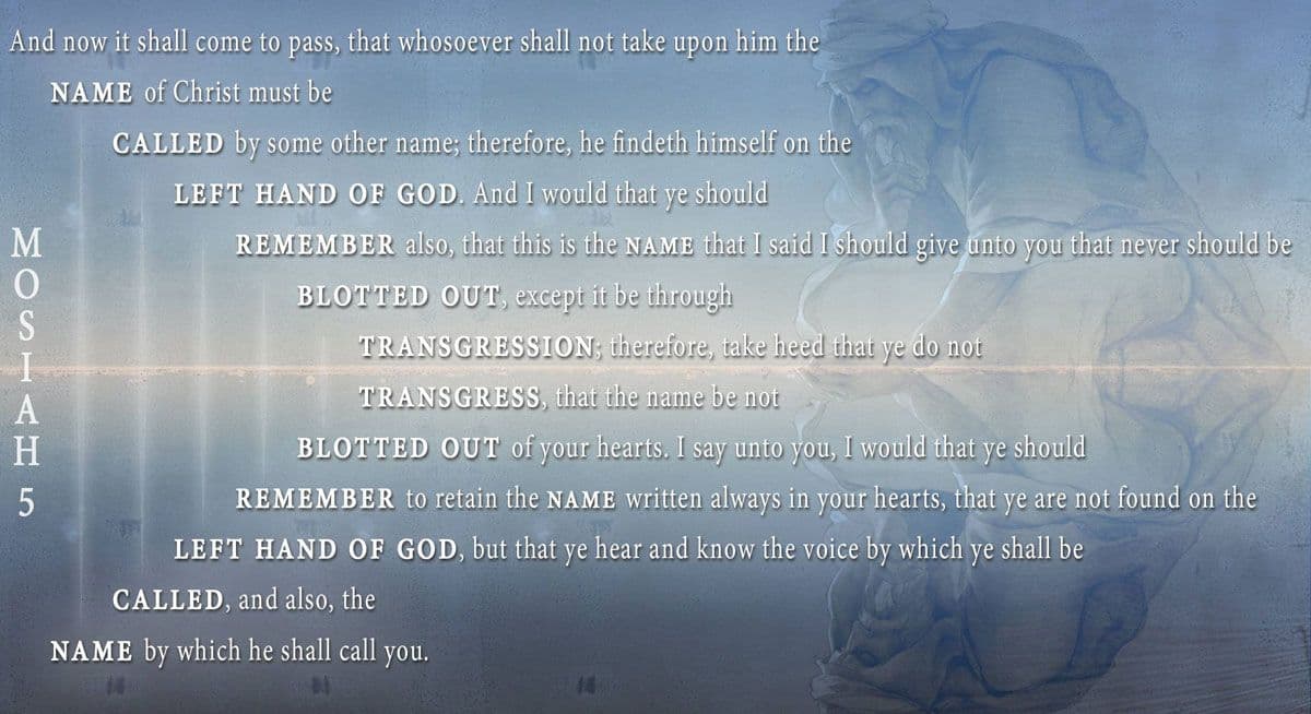 "This is the name that I said I should give unto you that never should be blotted out, except it be through transgression; therefore, take heed that ye do not transgress, that the name be not blotted out of your hearts. I say unto you, I would that ye should remember to retain the name written always in your hearts, that ye are not found on the left hand of God." Mosiah 5:11–12