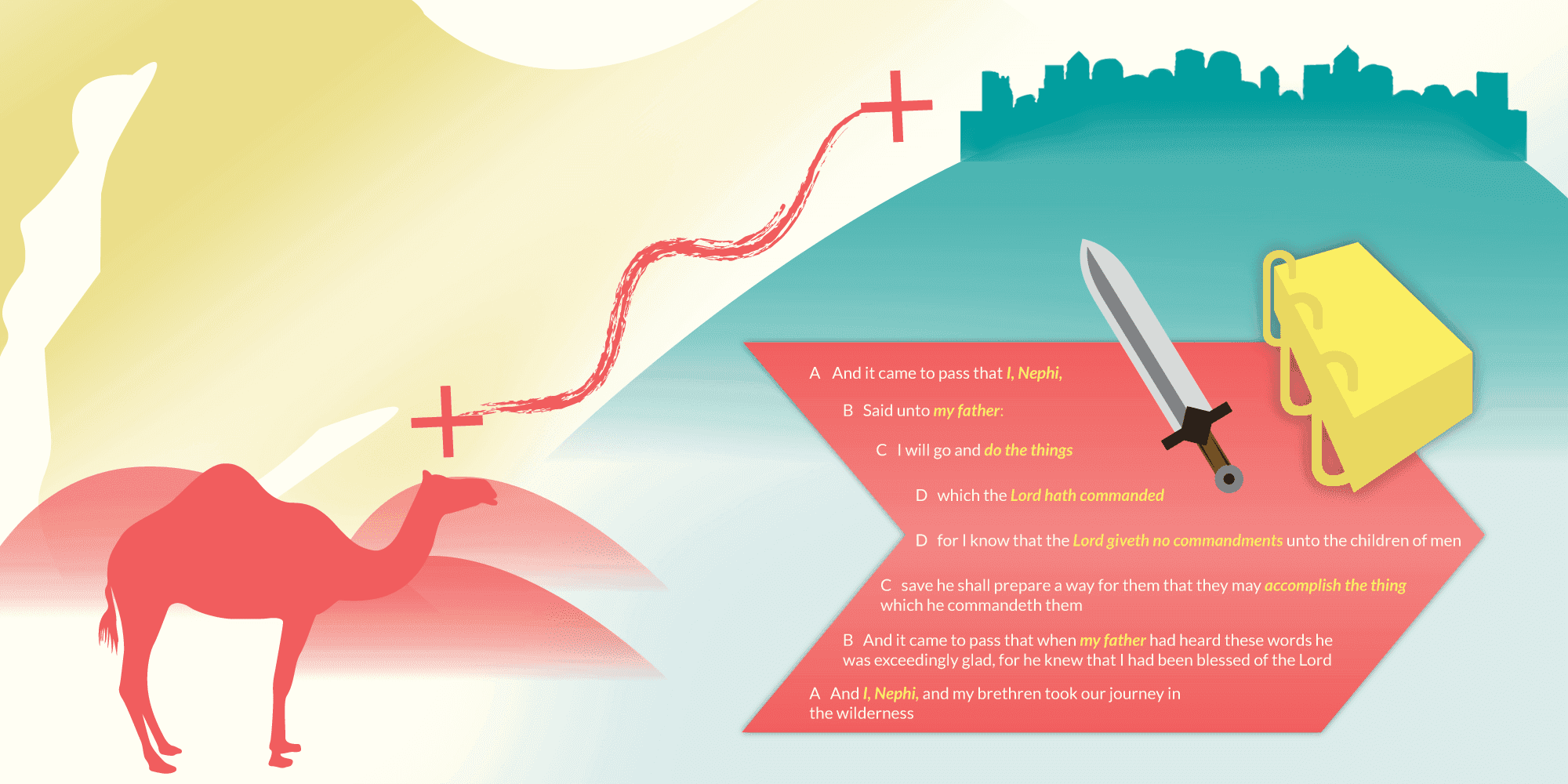 This sets up the rest of the story about getting the plates, where the Lord’s commandments are central: command or commandment is repeated 18 times total in 1 Nephi 3 and 4.5 Affirming this, Nephi’s response that he will “go and do” is part of a chiasm—a literary pattern where key words, phrases, or ideas are repeated in reverse order.6 The center of a chiasm is usually the most important part, and Nephi’s chiasm has the Lord’s commandments at the very center.