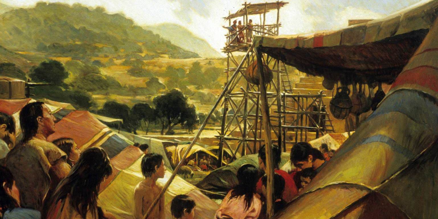 Following King Benjamin’s proclamation, his people gathered together from throughout the land of Zarahemla to go up1 to the temple to hear the words of their king (Mosiah 2:1). As they congregated around the temple with their families, the people set up tents for their families, each tent having its door open towards the temple. The people remained in their tents as they listened to King Benjamin speak (Mosiah 2:5–6).