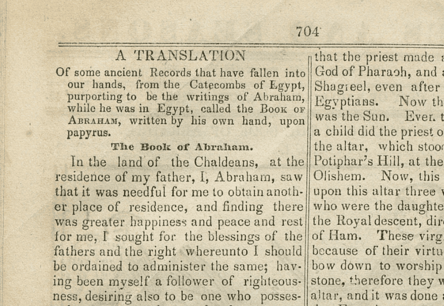 Multiple sources associated with the coming forth of the Book of Abraham spoke of Joseph Smith as translating the text.1 The Prophet himself used this language to describe his own activity with the text. For example, an entry in Joseph Smith’s journal under the date November 20, 1835 indicates the Prophet “spent the day in translating” the Egyptian records.2 In an unpublished editorial that was apparently meant to be printed in the March 1, 1842 issue of the Times and Seasons (the issue that saw the publication of the first installment of the Book of Abraham), Joseph Smith signaled his desire to “continue to translate and publish [the text] as fast as possible [until] the whole is completed.”3 What was published with the Book of Abraham was a preface announcing it as “A TRANSLATION Of some ancient Records that have fallen into our hands . . . purporting to be the writings of Abraham.”4